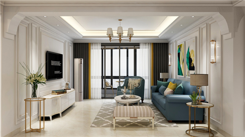 客厅的设计中,以白墙配合装饰线强调轻奢风格,搭配清新的蓝色沙发及亮眼的背景画扬起色彩的节奏感,简欧气韵透着一丝现代气质,摆脱欧式奢华的固有印象。