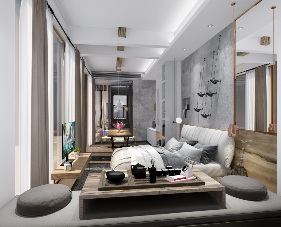 主卧在二层的一侧,色调柔和,质地讲究,不过于追求时尚,但浅灰的色调和木纹的运用,配合柔和的布艺,却能让心安静下来。正对中庭的落地玻璃窗,为主卧提供了最佳的欣赏角度,彰显着业主不凡的品位。