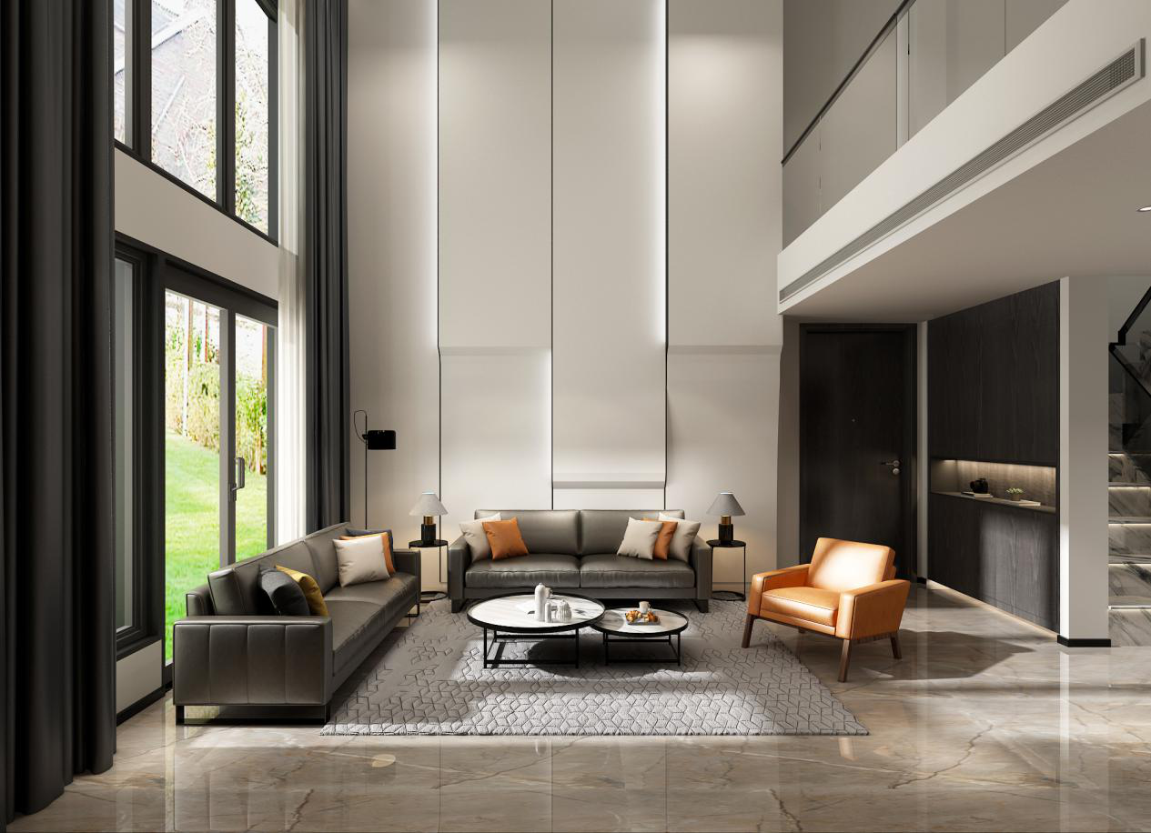 无缝拼接的白色背景墙,其黑色线条结合内置灯光争强视觉立体感,营造了整体空间大气恢弘的气质。褐灰的皮质沙发彰显主人的气质品味,高级灰的地毯和暖橘色的腰枕延续了一楼整个客厅的轻奢氛围。