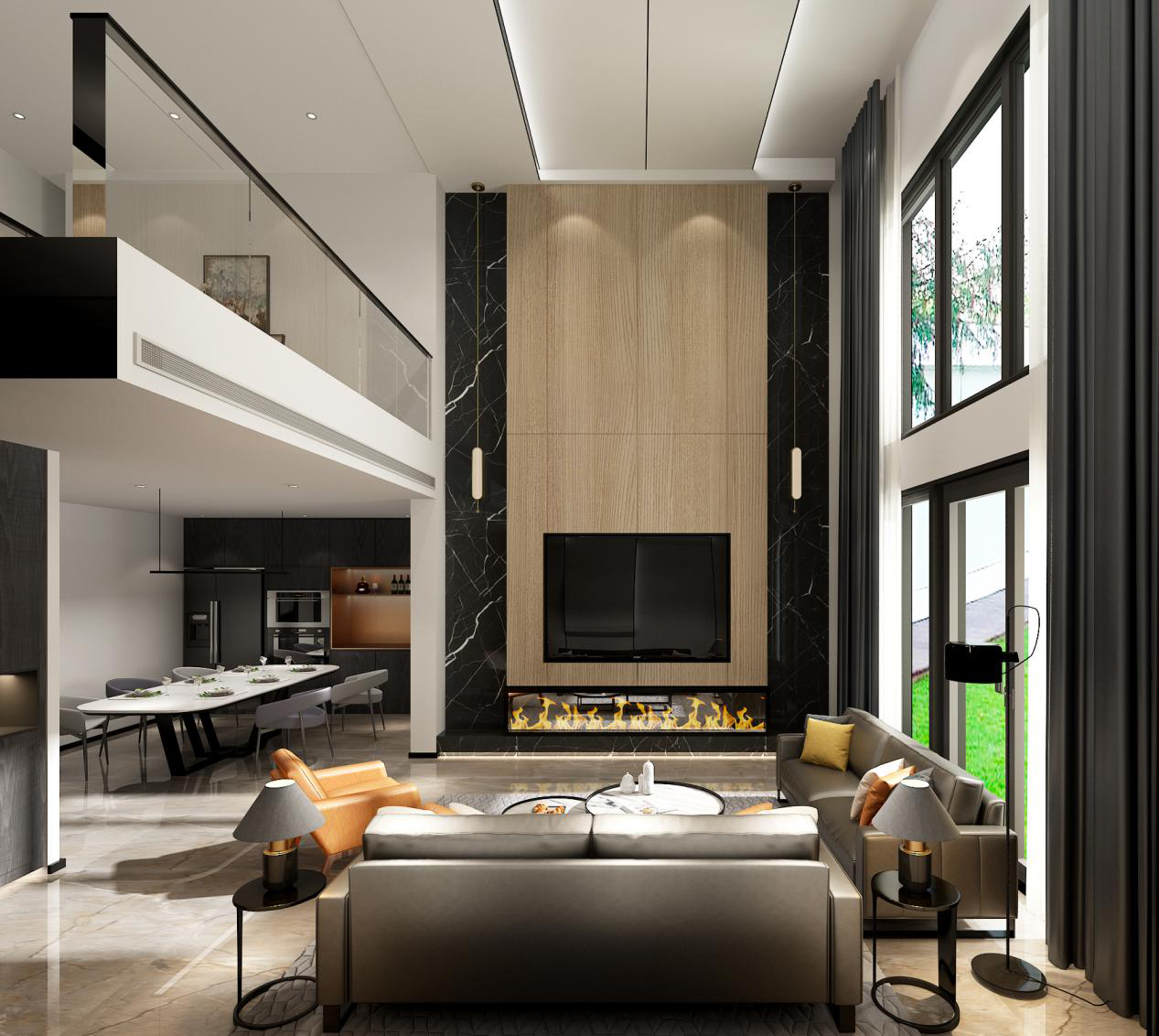 挑空米的客厅空间,成为了整个设计的最重点区域。整个东面墙面改造为全落地玻璃,清晨的第一缕阳光穿过客厅,大理石背景墙上的线条而形成地上的光影,显得俏皮闲适又慵懒自在,充满了自然的生活味道。