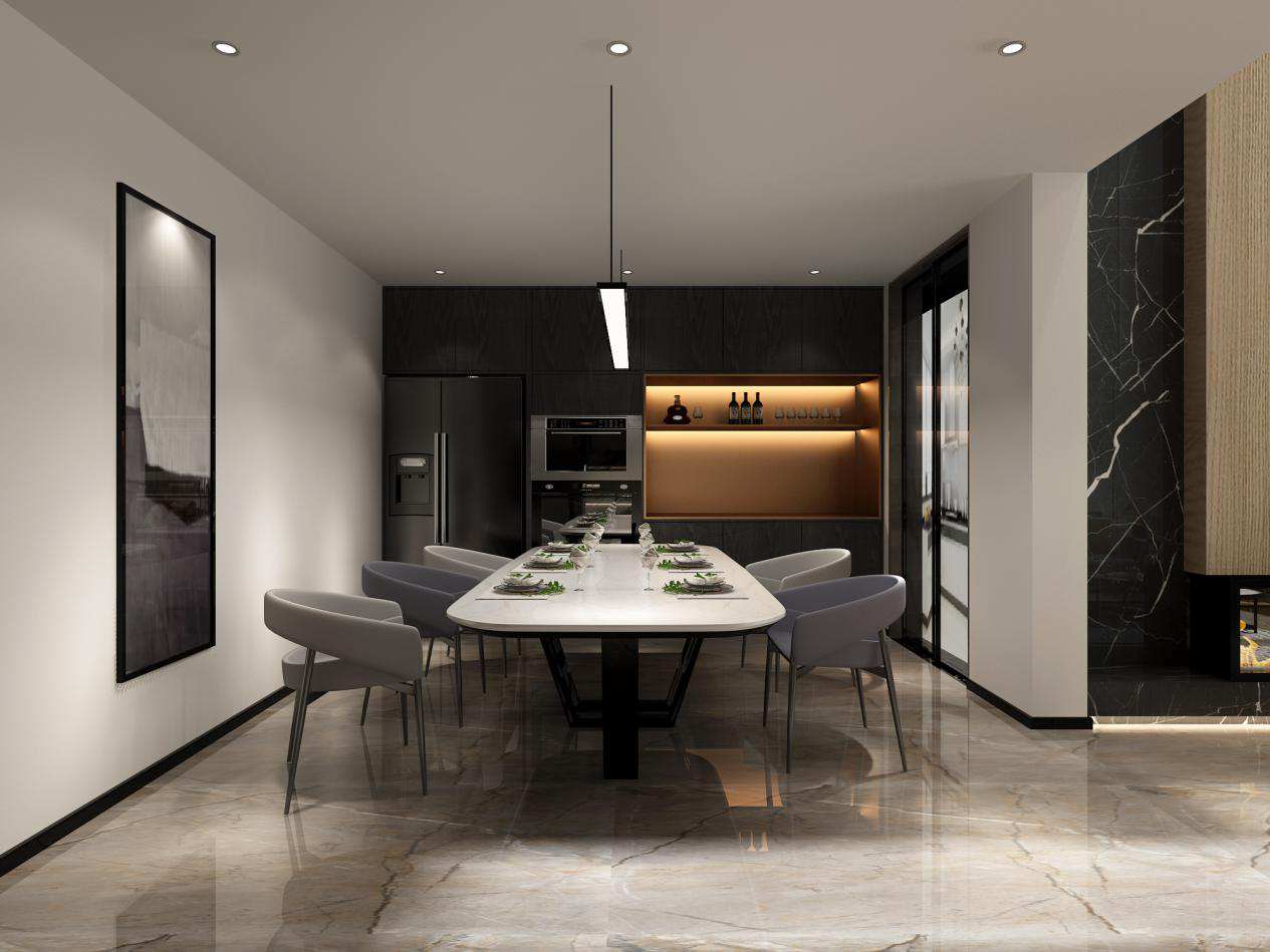 餐厅整体以灰色系作为底色,一体式黑色多功能柜体凸现白色餐桌,黑白灰的和谐融合彰显时尚经典的色彩格调。筒灯与餐厅吊灯的光影变化,厚重而沉稳的皮质餐椅,橘黄的橱柜内置灯,张弛有度,让空间层次感更强。