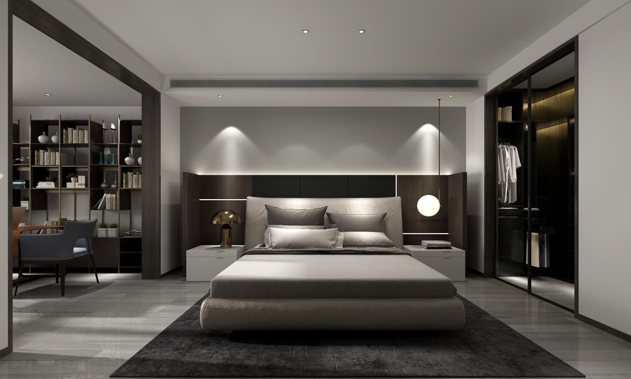 次卧整体延续主卧的风格,床头创意吊灯反映了存在与缺失、透明与发光、灯光与流动性的概念。整体灰色在夜晚更显沉郁,浮躁被摒弃,使居住者沉浸在夜的怀抱里。