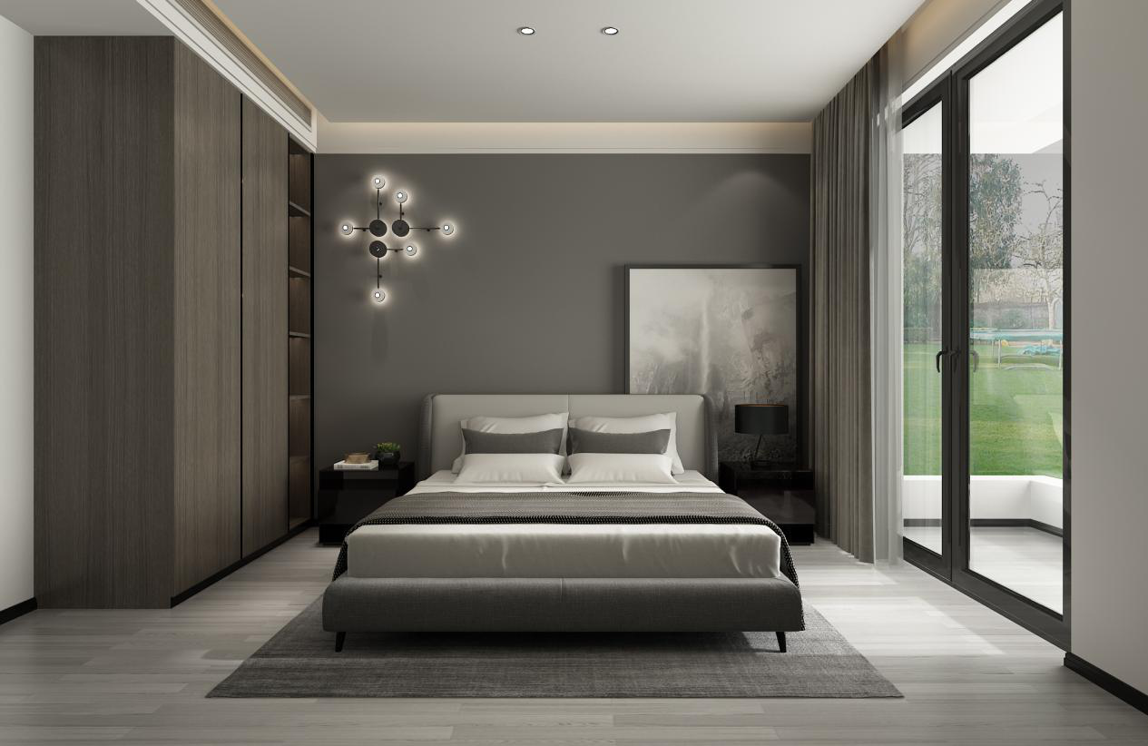 主卧是宅邸中最私密的空间。床后惹眼的胡桃木色与单边床头运用吊灯,有种对称的美,给人一种个性而不失优雅的感觉。