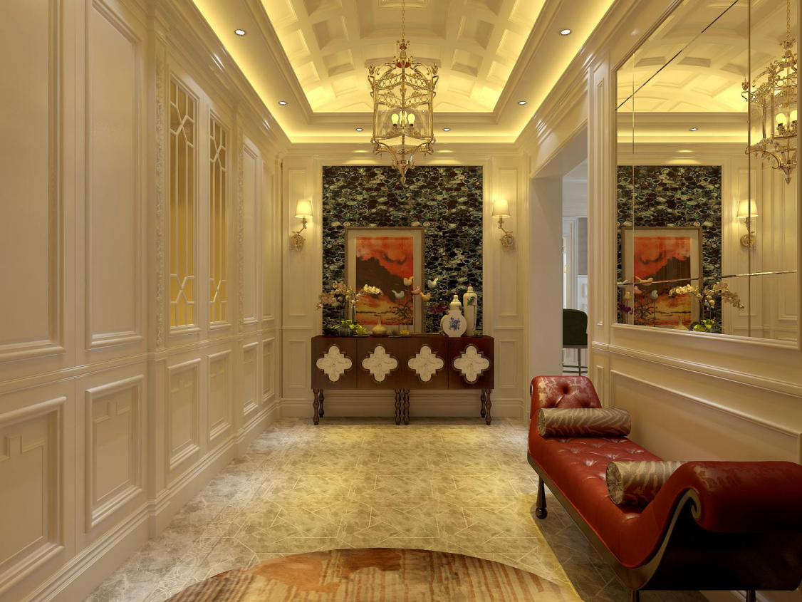 礼仪层前门庭的设计中带着岁月沧桑感让你能感受到温度与厚度呈黯淡无光的奶白色墙板与深红宝石色换鞋榻的和谐相处,即强调了门庭高贵的仪式感同时与典雅精致并存。拱形天花设计让人有行走在宫殿长廊的感觉。墙面上一整面的镜子给人极大的视觉冲击力,仿佛是在体验一场视觉盛宴。