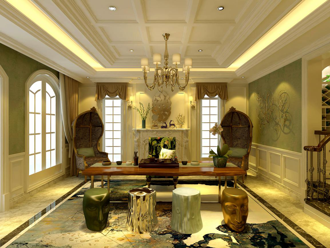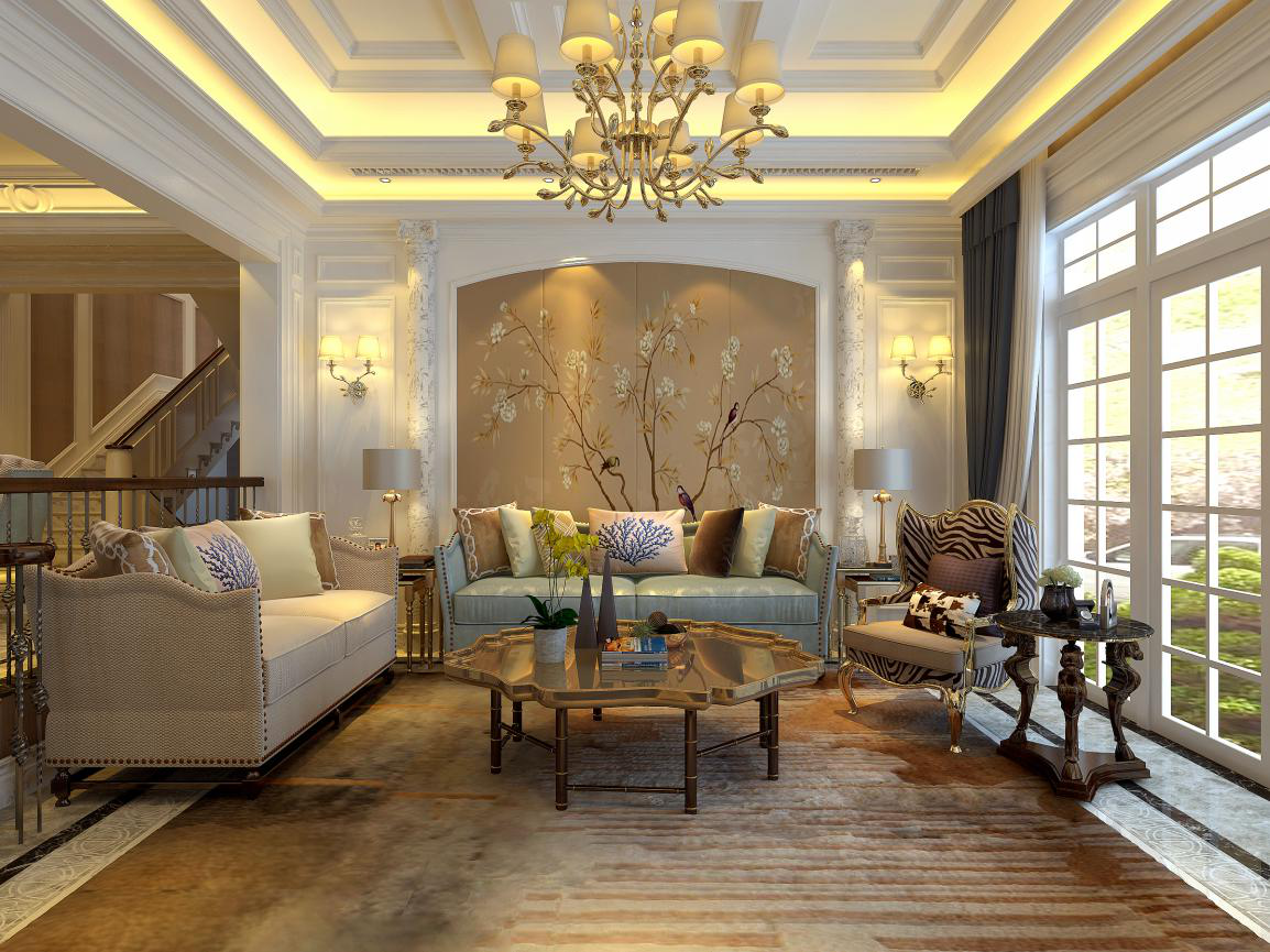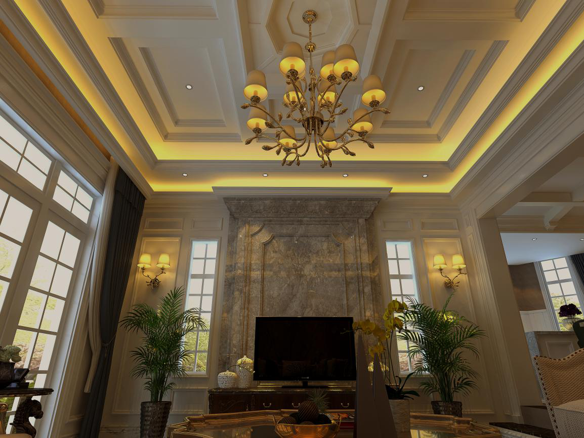 既然作为别墅,就要将别墅的优势加倍凸显。因此,在电视背景墙的设计上,选用大理石为材质基本为全直线型体现造型表达了法国新古典的严谨、方正与对称,还增加了窗户,使得窗外的自然风光随着光线缓缓渗入、温暖流淌。