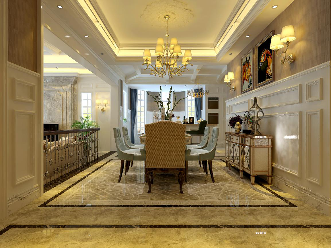 毗邻客厅的餐厅延续了客厅的奢华与典雅,地面上采用了两种以上深浅不一的高档大理石拼贴图案以产生三维立体的视觉效果、真丝壁布、家具都与客厅保持了统一,实现了客餐厅的空间整体性。客厅与餐厅的水晶吊灯选择上,设计师采用了大小不一的同一款式,在整体基础上也增添了一份个性与活泼。暖暖的壁灯、半高的木质护墙板为温暖的赭色墙壁做了装饰,营造一份幸福感。