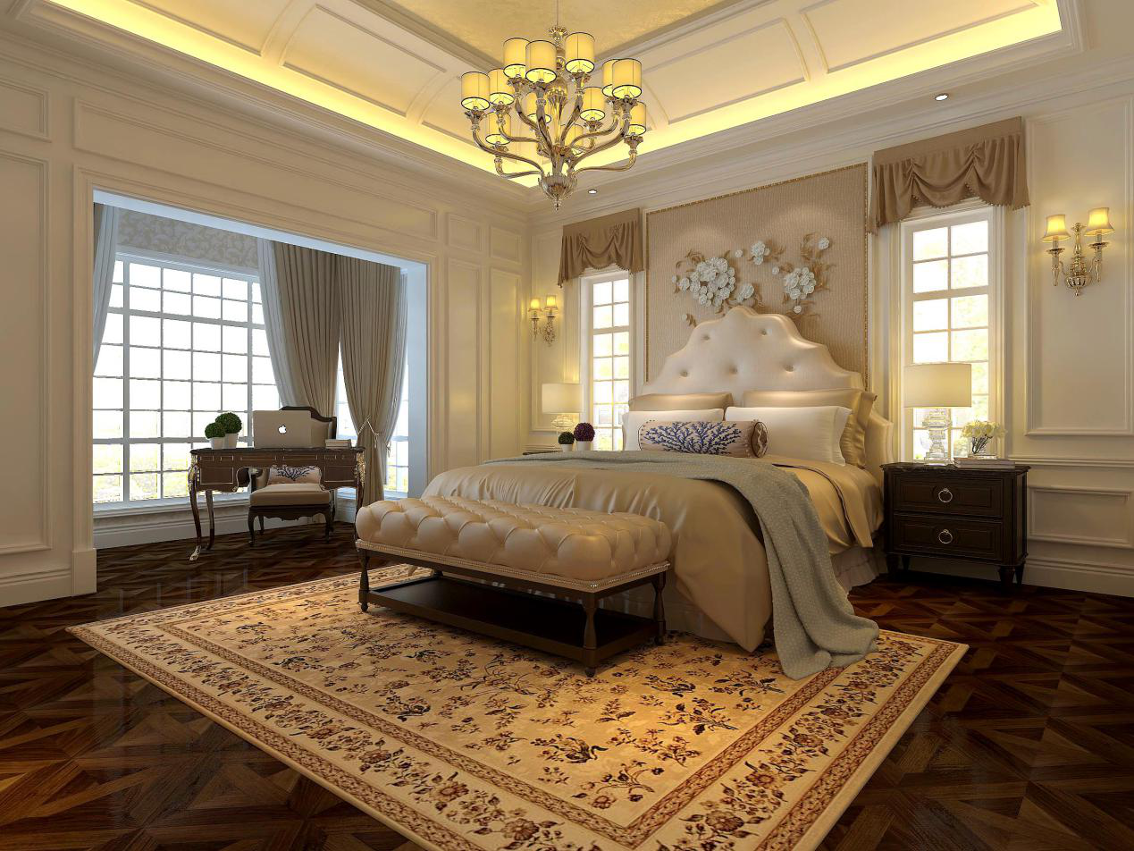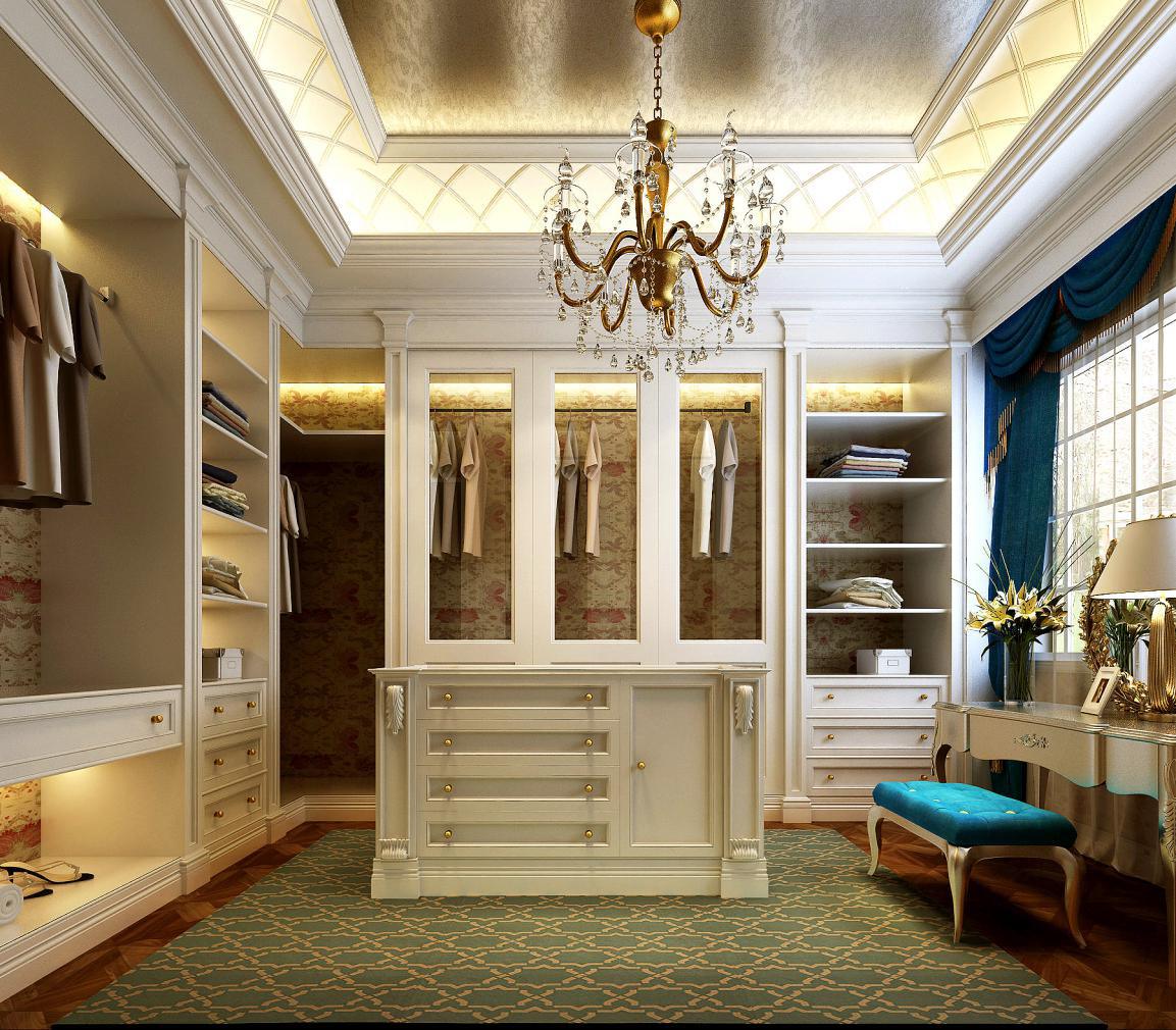 为增加功能性,设计师在主卧空间里配套了独立全明的衣帽间和主人卫生间及水吧共同构成了一个舒适的私密环境。主人睡眠区则是利用了房间本身的特点,把采光性做到了极致,异型吊顶解决了空间压抑的问题,奶白色木质墙板的使用贯穿始终,浅棕色的真丝软包床头背景用真丝滚绳勾勒让整个卧室宁静下来,于静谧中将家的意义升华。衣帽间的玫瑰红色环绕花卉纹样及宝石蓝天锦缎窗帘等元素强调了整个私密空间的优雅与奢华。