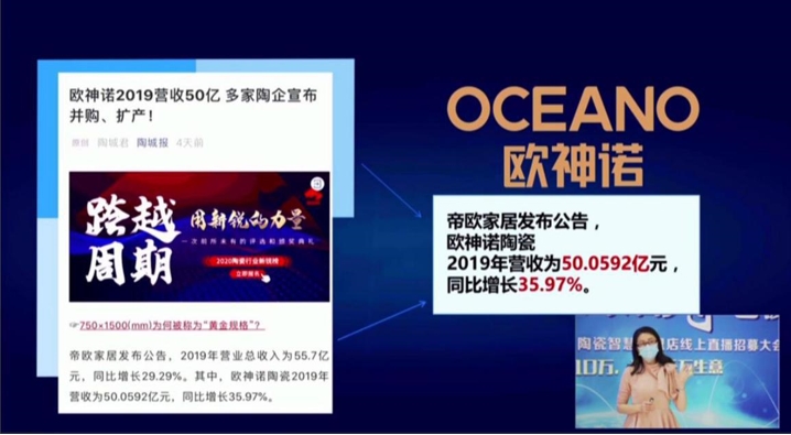 因此在直播会开始,欧神诺陶瓷云商学院院长章艾女士就以欧神诺2019年营收50亿开局,向直播间的嘉宾详细地介绍了《不一样的欧神诺》。