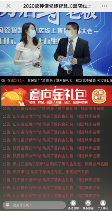 在直播中,欧神诺陶瓷销售管理中心副总经理黄浪平先生先是通过分析瓷砖行业发展现状,手把手教直播间的嘉宾如何看清未来发展趋势、抓住机遇,自己创业当老板。黄总表示,在这个不确定的年代,选择比努力更重要。而欧神诺智慧门店凭借其绝对的优势加盟商的不二选择。黄总还在直播间向加盟商展示了欧神诺的绝对加盟优势,对于此次加盟商,工厂将直接拿出亿元来补贴,并且由专门的团队全力扶持创业,现场气氛一度达到高潮。
