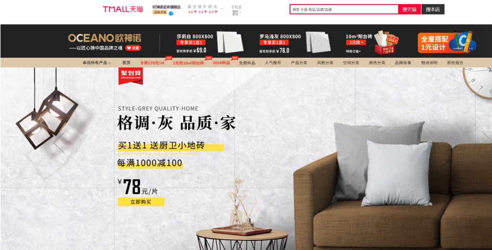在线上,欧神诺陶瓷官方旗舰店已进驻天猫、京东等各大电商平台,为客户提供便捷的B2C、O2O等产品服务,为线下门店打下了坚实的基础。
