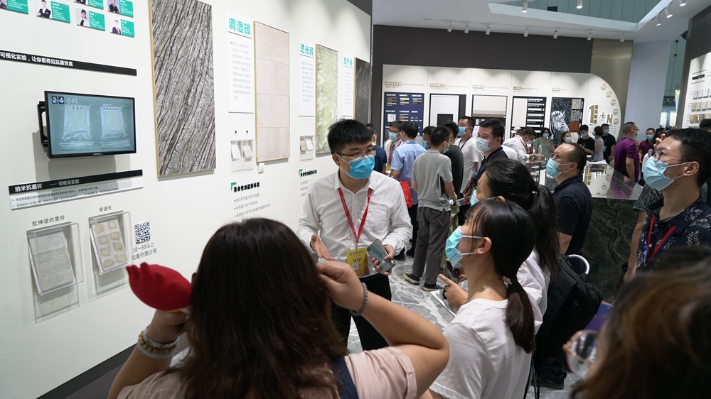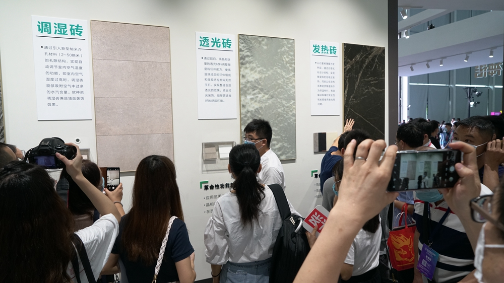 整个展会,各个展位瓷砖展示各色各样,但都是普通的装饰材料。在欧神诺展位上,却展示着既拥有瓷砖的装饰效果,也具备抗菌、发热、调湿等功能的瓷砖。