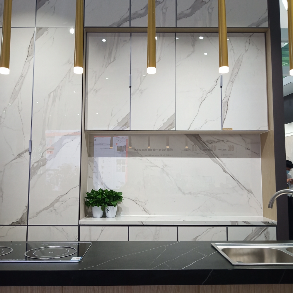 欧神诺的惊喜远不止这些。当下最热最火的岩板,在欧神诺展位上也可以看到,还有1200×2400mm的连纹大板,应用范围从下地到上墙、背景墙,从台面到灶台、橱柜、浴柜,个性定制,全屋应用。