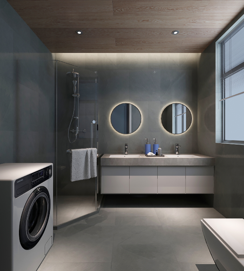 卫浴采用了简约的线条,以及质感细腻,色彩素雅的水泥砖,让空间富有禅意。