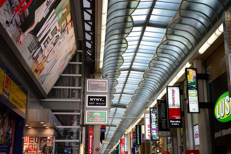 心斋桥作为大阪最大的购物区,是以带有拱廊设施的心斋桥筋商店街为中心发展起来的。这里大型百货店、百年老铺、及各种风味的小店铺鳞次栉比,丸井(MARUI)和大丸是日本最富盛名的商店。大阪为数不多的HELLO KITTY专卖店,这里就有,Disney的专卖点也在这里落户。