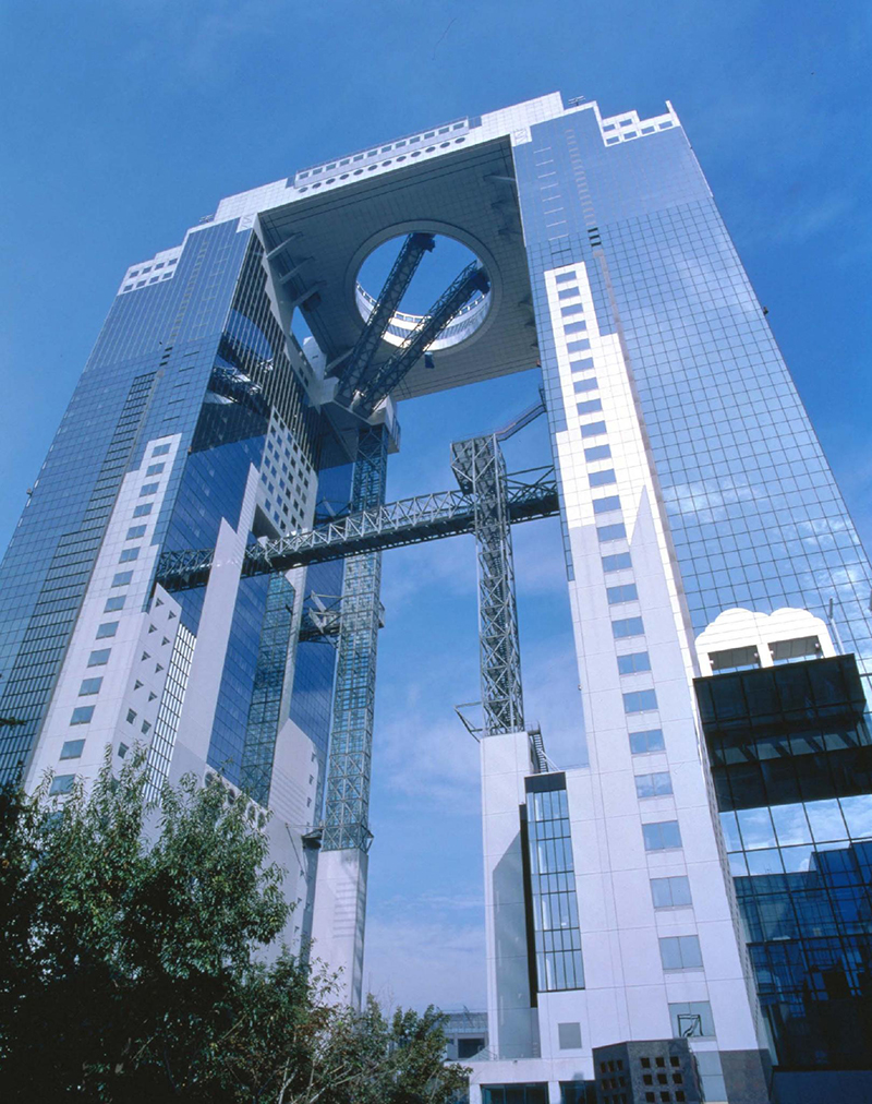 梅田蓝天大厦的建筑形态是世界上极为罕见的“连接式超级高层大厦”。1993年日本大阪的新梅田城完成。梅田蓝天大厦成为了其核心。大厦的顶层建有空中庭院,随着时间变换,这座被透明玻璃覆盖的超级高层的大厦会与天空融为一体,让人犹如走入仙境,当整个天空映入其中,便构成了一个悬浮在空中的庭院。