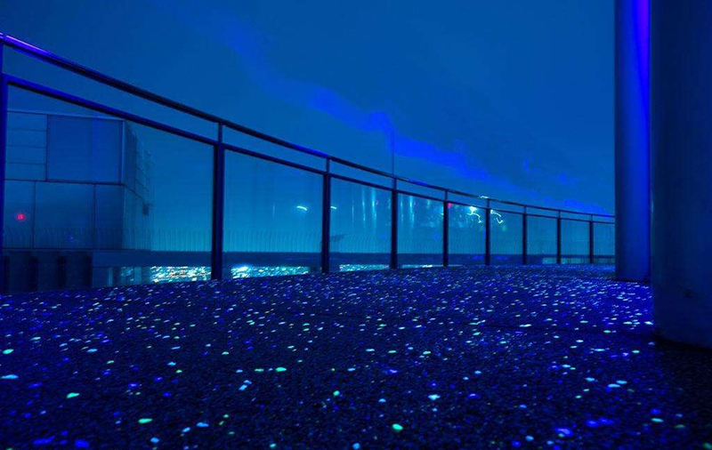 闪烁的星光其实是由青色、紫色的蓄光石和蓄光砂绘制的。这些闪闪发光神秘的颜色勾勒出银河系和星座,走在这里就好像在星空散步。