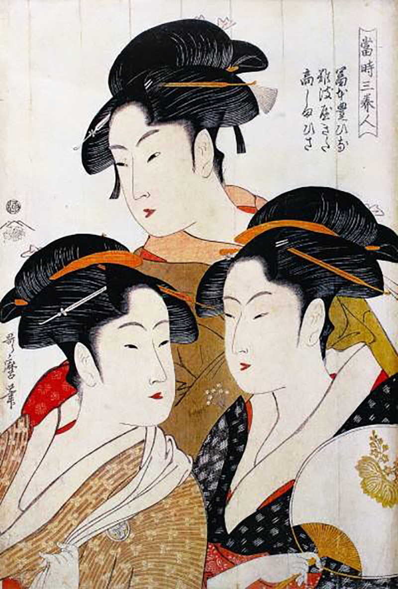 其实,浮世绘的题材极其广泛,有社会时事、民间传说、历史掌故、戏曲场景和古典名著图绘,有些画家还专事描绘妇女生活,记录战争事件或抒写山川景物……它几乎是江户时代人民生活的百科全书,又因为是在十八世纪末期经济富庶的江户城,人人都奉行“人生如梦,即时享乐”的哲学,所以画面洋溢着欢愉和美貌。