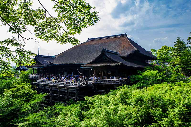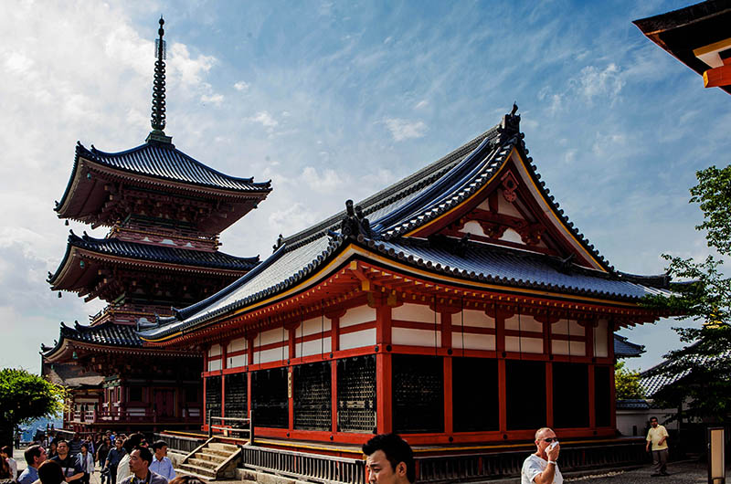 清水寺位于京都东部音羽山的山腰,始建于778年,是京都最古老的寺院,被列为日本国宝建筑之一。从延镇上人在音羽瀑布上参拜观音开始,到798年坂上田村麻吕改建为佛殿,清水寺从此成为恒武天皇的敕愿寺。历史上清水寺曾数次被烧毁并重建,现存的大部分建筑始建于公元1633年,后于1994年被列入世界文化遗产名录。寺院占地面积13万㎡,附近都是京都的名胜古迹,四周绿树环抱,春季樱花烂漫,秋季红枫飒爽,因而常年有许多民众、游客前来参拜游玩。