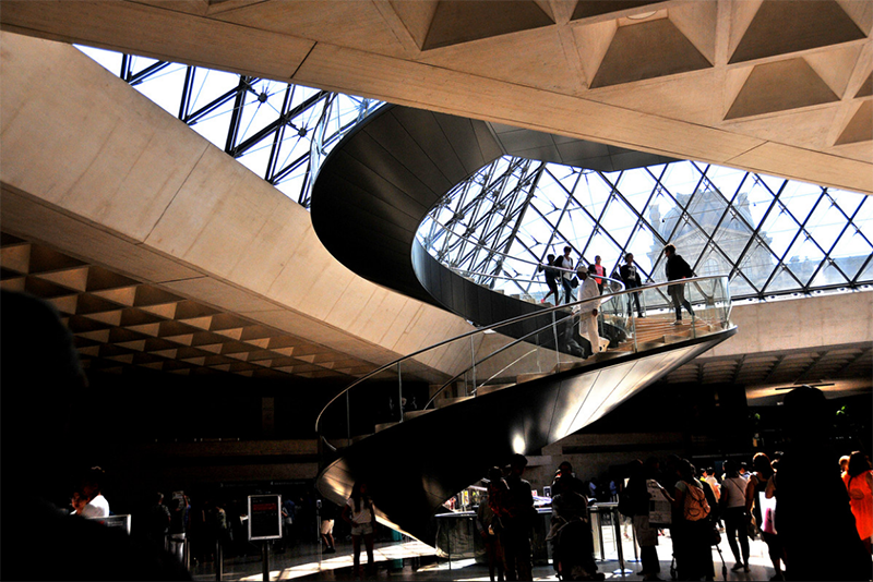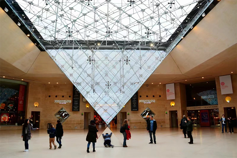 通过开包查验的严格安检后,顺着螺旋形的楼梯来到了底下的中央大厅,午后的阳光透过金字塔的玻璃泻下,在玻璃的折射下呈现出美丽的七彩光束,耀眼的光芒非常漂亮。玻璃金字塔呈锥形似的倒悬在大厅中央,与地上的正三角形的小金字塔相互对应,强烈的反差给了人不一样的视觉效果。惊艳之际,不得不为一代大师贝聿铭独到的设计和巧妙的构思所折服。