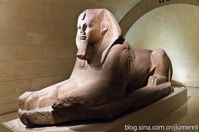 排队通过检票口后,径直走即可到达中世纪卢浮宫的城壕遗迹。继续向前走至台阶,就可以看到台阶上的古埃及斯芬克斯狮身人面像了。