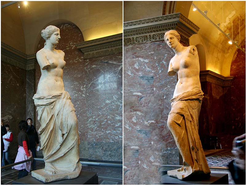 沿着在斯芬克斯像左侧的台阶可通向古希腊罗马雕塑馆,在大厅的尽头我们将看到卢浮宫的第一宝——米洛岛的维纳斯( Vénus de Milo)。