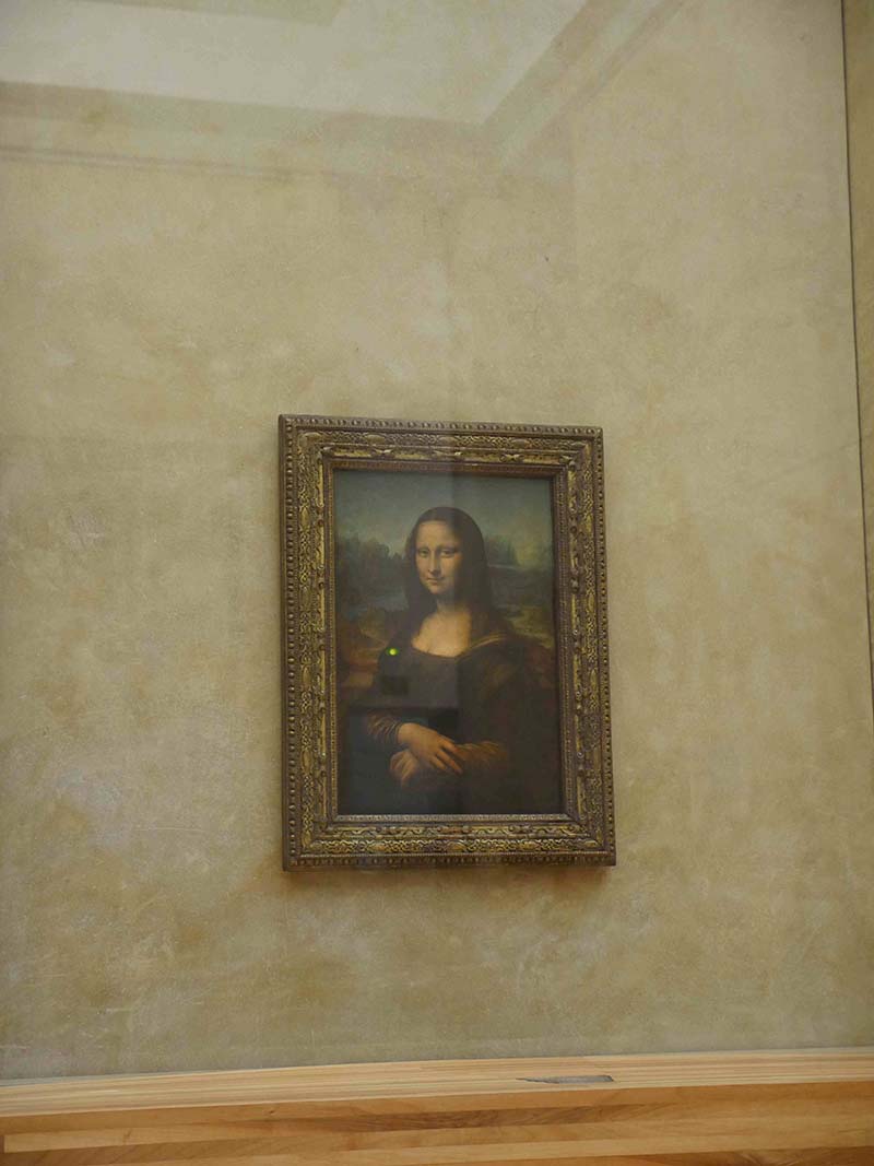 在胜利女神像前向后转,正对着的大厅就是红厅,径直走到展厅的尽头。进入下一个展厅——德农馆,然后进入左侧蒙娜丽莎厅,就可以看到卢浮宫第三宝——蒙娜丽莎(La Joconde)了,如果运气好还能拍到这样这样的效果,记住不要开闪光灯哟。