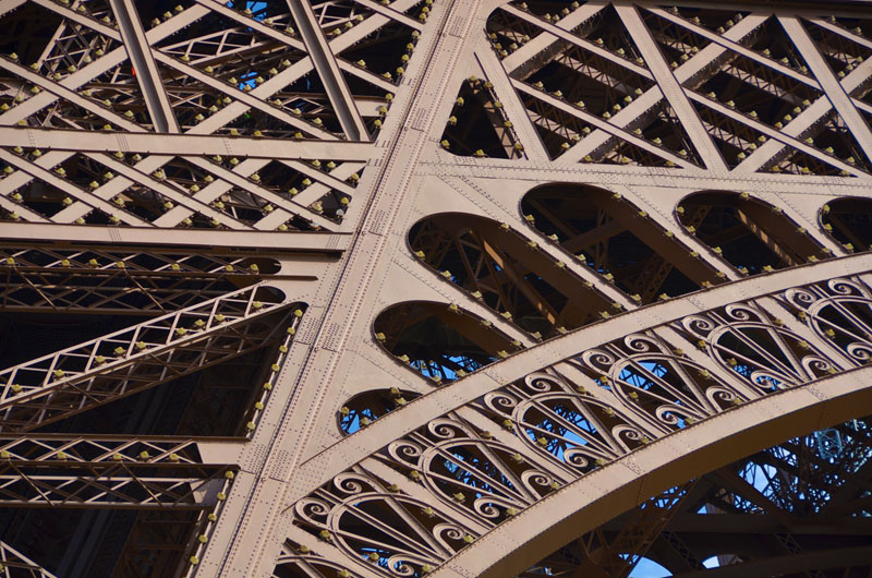 埃菲尔铁塔是钢架镂空结构,由很多分散的钢铁构件组成的——看起来就像一堆模型的组件。整座塔使用钢铁构件有18038个,重达10000吨,施工时共钻孔700万个,使用1.2万个金属部件,用铆钉250万个连接固定。除了四个脚是用钢筋水泥之外,全身都用钢铁构成,共用钢铁9000多吨。虽然埃菲尔铁塔总重10000t,但是,据说它对地面的压强,只有一个正常的成年人坐在椅子上那么大。