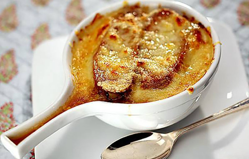 酥皮洋葱汤被称为“汤中的王后”。纽约时报的美食专家阿曼达赫瑟(Amanda Hesser)曾这样评价这道菜:“这是我所喝到过的最神奇、也最美味的汤了。当酥皮洋葱汤刚出炉时,看起来外壳呈金黄色,与面包布丁非常类似。”进餐时可以搭配博若莱新酒和巧克力松糕。