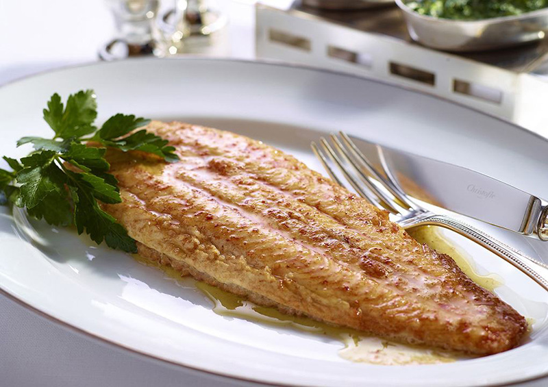 Sole,中文译为塌目鱼,上海人叫“涅塌鱼”,是法国本土诺曼底海域以及西部大西洋流域大量出产的海鱼。虽然塌目鱼在法国的产量不少,但是因为它极为细致的肉质,以及它在法国饮食里的重要角色,价格一直都比较昂贵。在进餐时,可以搭配白葡萄酒,比如桑塞尔白葡萄酒,和布列塔尼特色甜点。