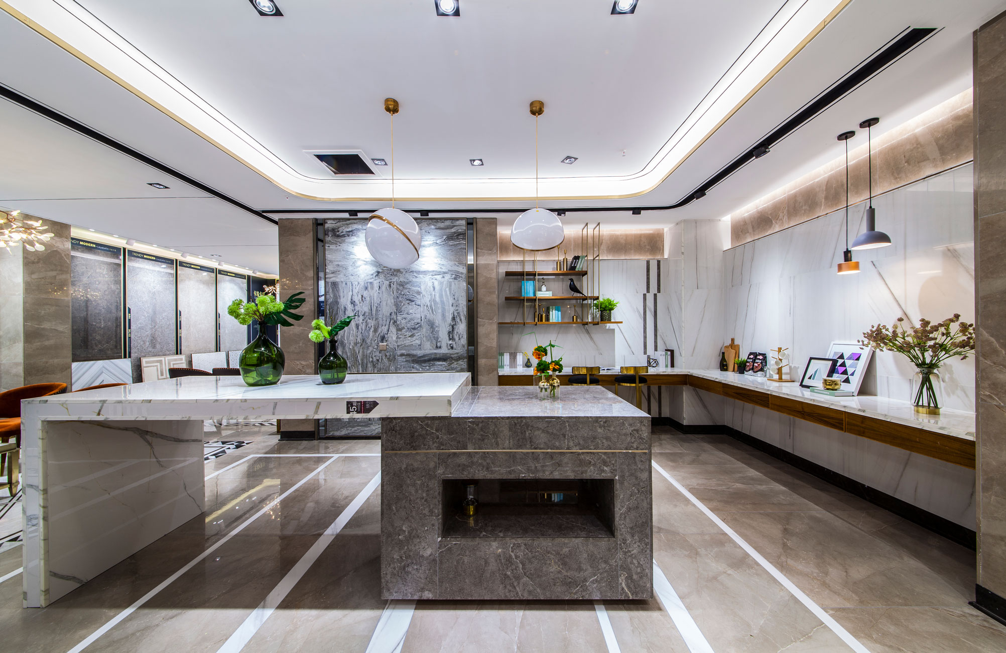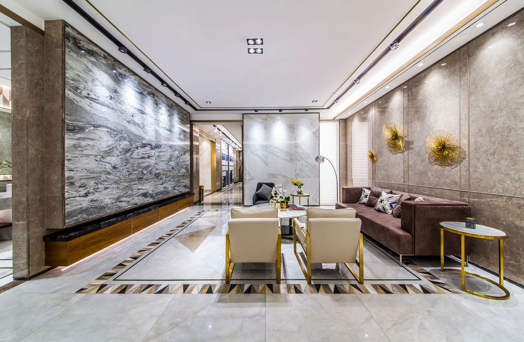 吧台左转进入到这个“玄幻瑰丽”客厅。背景墙同样也是用了这个九龙壁(棕),不过在客厅的这个空间上,面积更大,气势更加磅礴。地砖使用凯撒(灰),配搭碎花线条,然后墙砖用贝罗(棕),整个格局层次分明,在灯光的映耀下显得十分明丽,温暖。