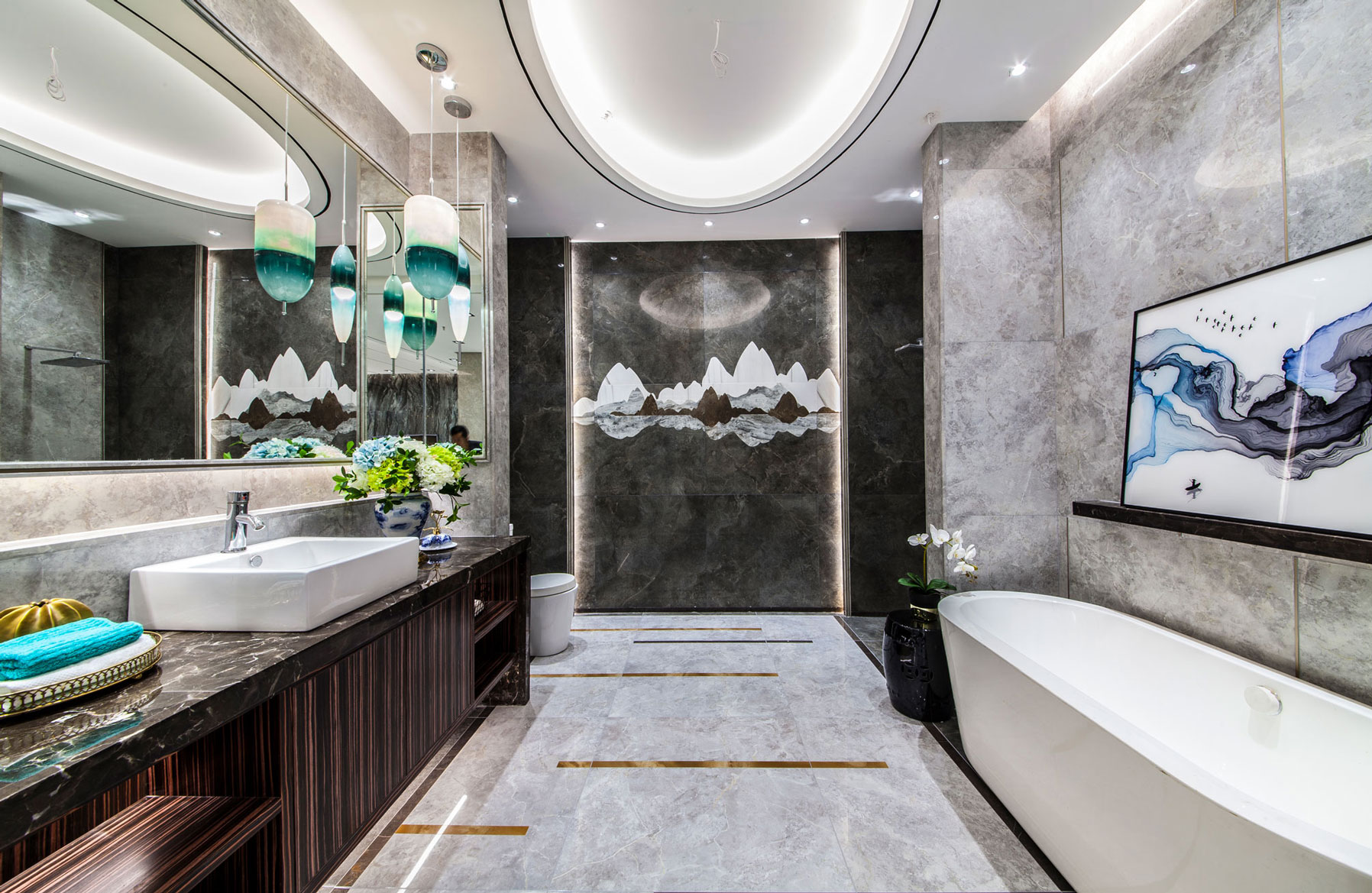 这间中式山水风格卫浴就是卡萨罗最好的答卷,西里(灰)内敛素雅,墙砖贝罗(黑)就像一幅黑色的画卷,搭配精致的山水拼花,打造出典雅的中式卫浴空间。