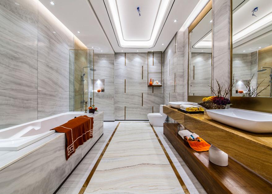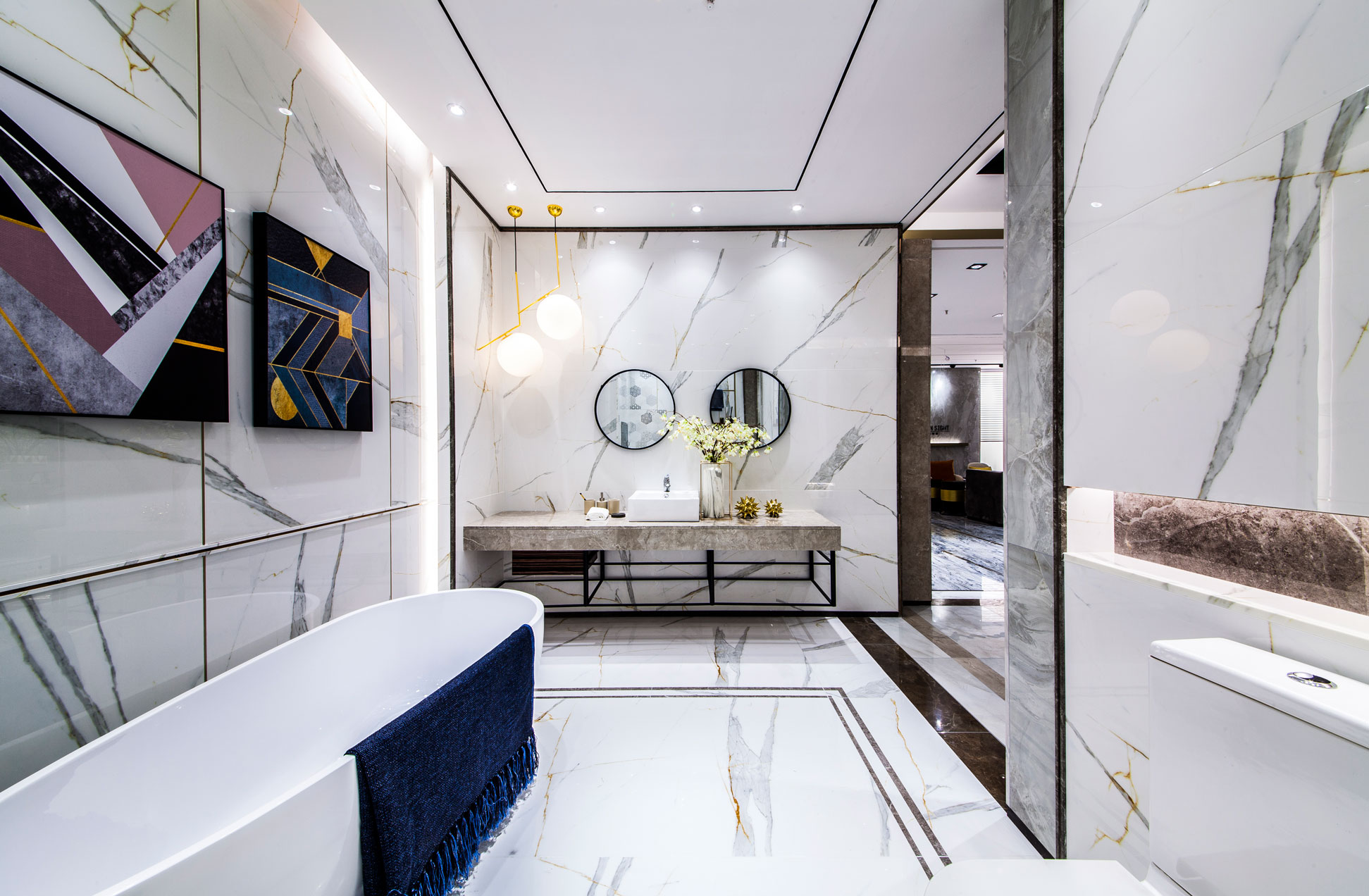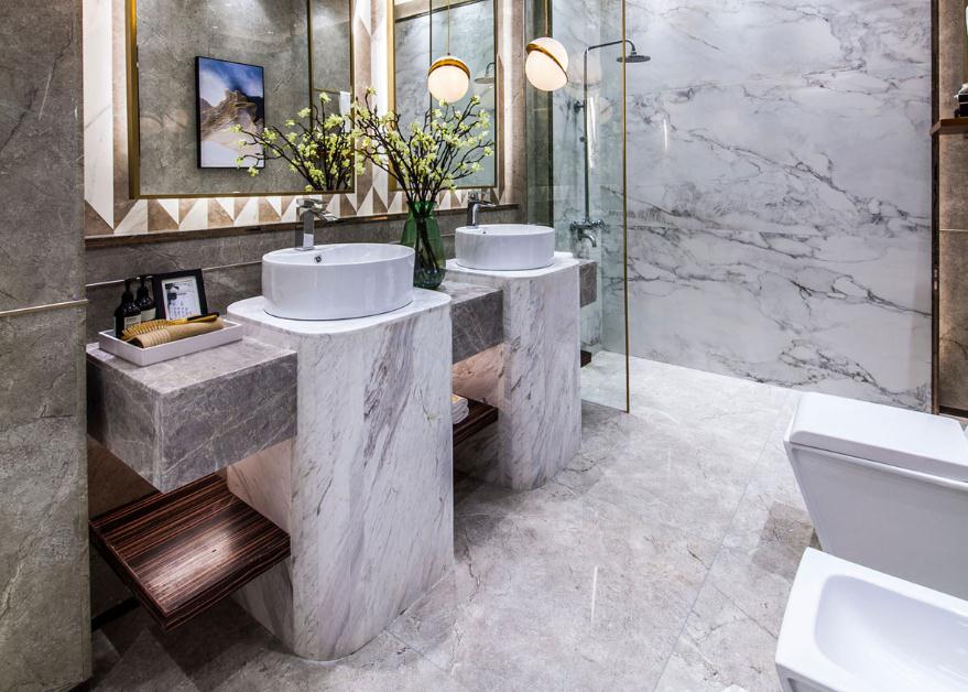 解说:地砖、墙砖、背景墙:卡拉卡塔。 这间卫浴空间,卡拉卡塔系列底坯、面釉白度双重升级,以极简主义的设计风格,独家的45°超超白配方, 表面更光滑细腻、立体通透,无限逼真,具有贴近天然大理石的自然美感。