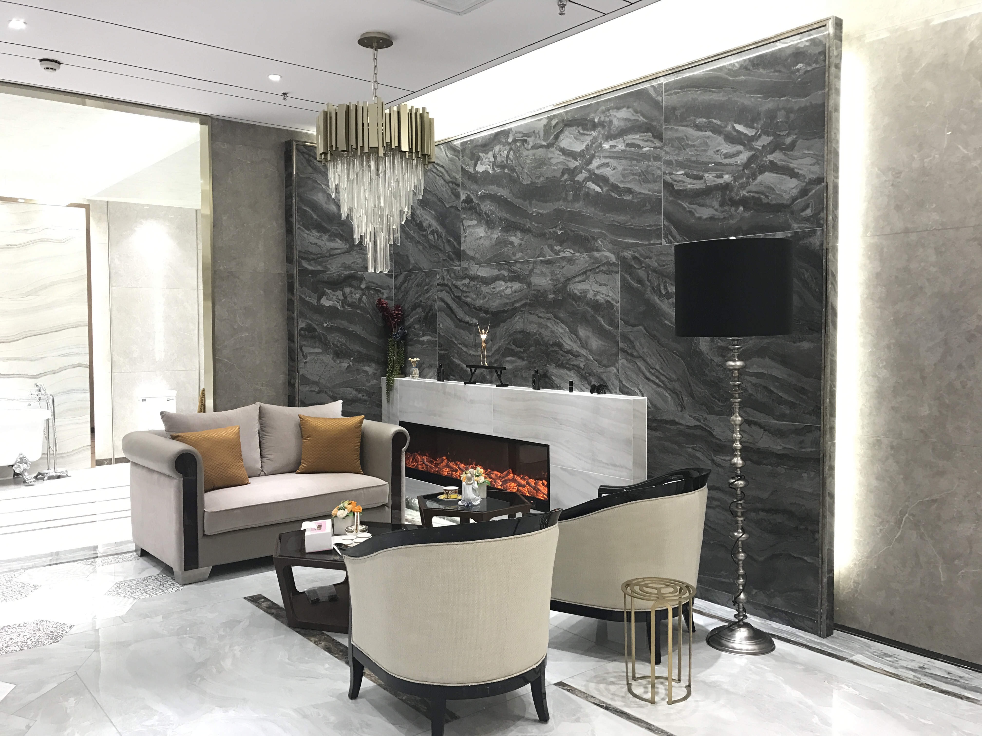 解说:地砖:【 SCM112DE清泉玛瑙 】,【 SCM116DS梦幻银灰 】这间以淡雅的灰调,沉稳内敛,自然纹理的客厅,呈现出不华丽却韵味别致,柔美的现代生活气息。