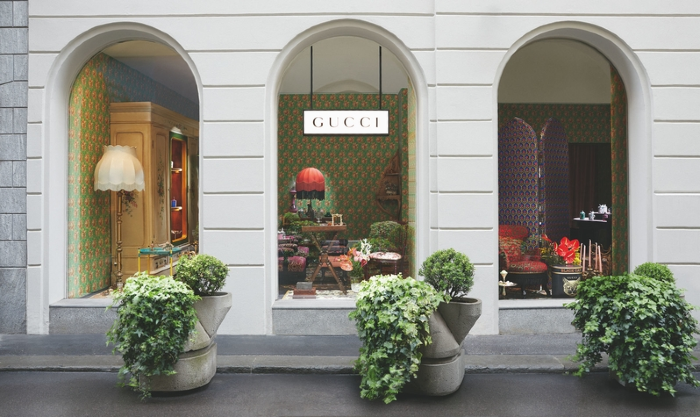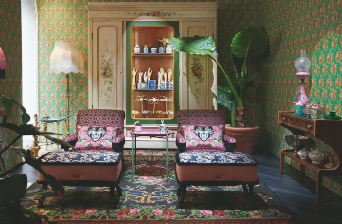 在米兰时装周期间,Gucci就开了一家限时快闪店,带来了Gucci Décor家居系列,更加入了家具、瓷器、餐具和毯子等新成员,全方位打造一座浪漫主义风格“花园”。小到餐具、餐盘、抱枕上的图案,大到整面墙的碎花墙纸、图案华丽的地毯、一墙柜的瓷器展示区,设计师Alessandro Michele用个人美学呈现了家居装饰艺术的巅峰,整个空间最让人着迷的当然是丰富的色彩语言以及各种Gucci当下火热的图案元素,轻松地打造出了一个文艺复兴之家。